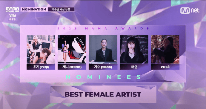 虎扑10月16日讯2025年MAMA颁奖礼提名名单于10月16日正式公布,宋雨琦入围“最佳女SOLO”奖项,将与BLACKPINK成员Jennie、金智秀、朴彩英及少女时代金泰妍同台竞争。同时,“最佳